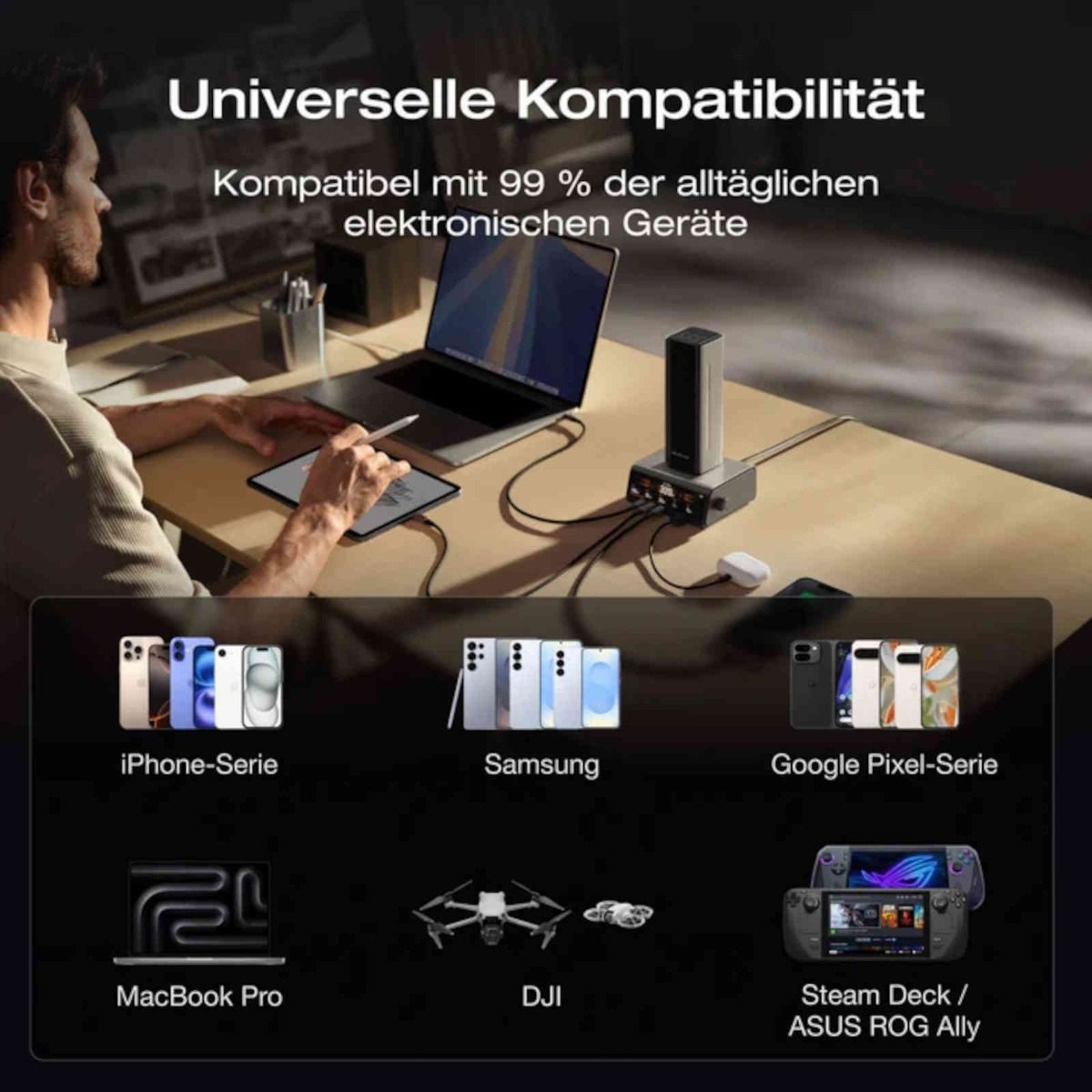 - Sehr hohe Ladeleistung: 300 W Gesamtleistung, 140 W USB‑C für laptops.