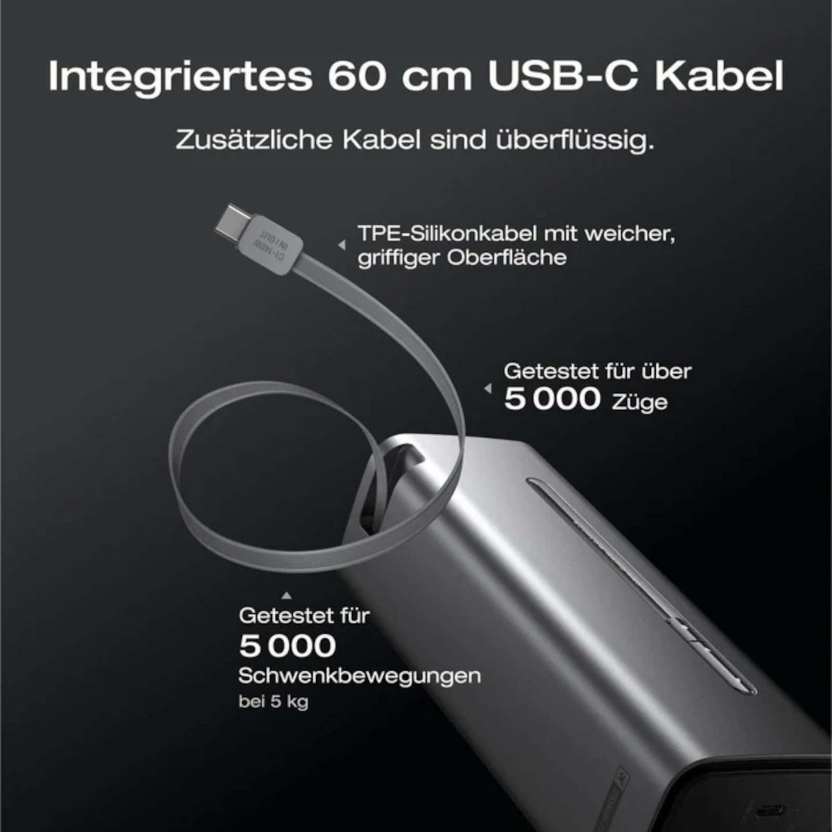 - Integriertes 140 W USB‑C Kabel (60 cm): kein zusätzliches Kabel nötig.