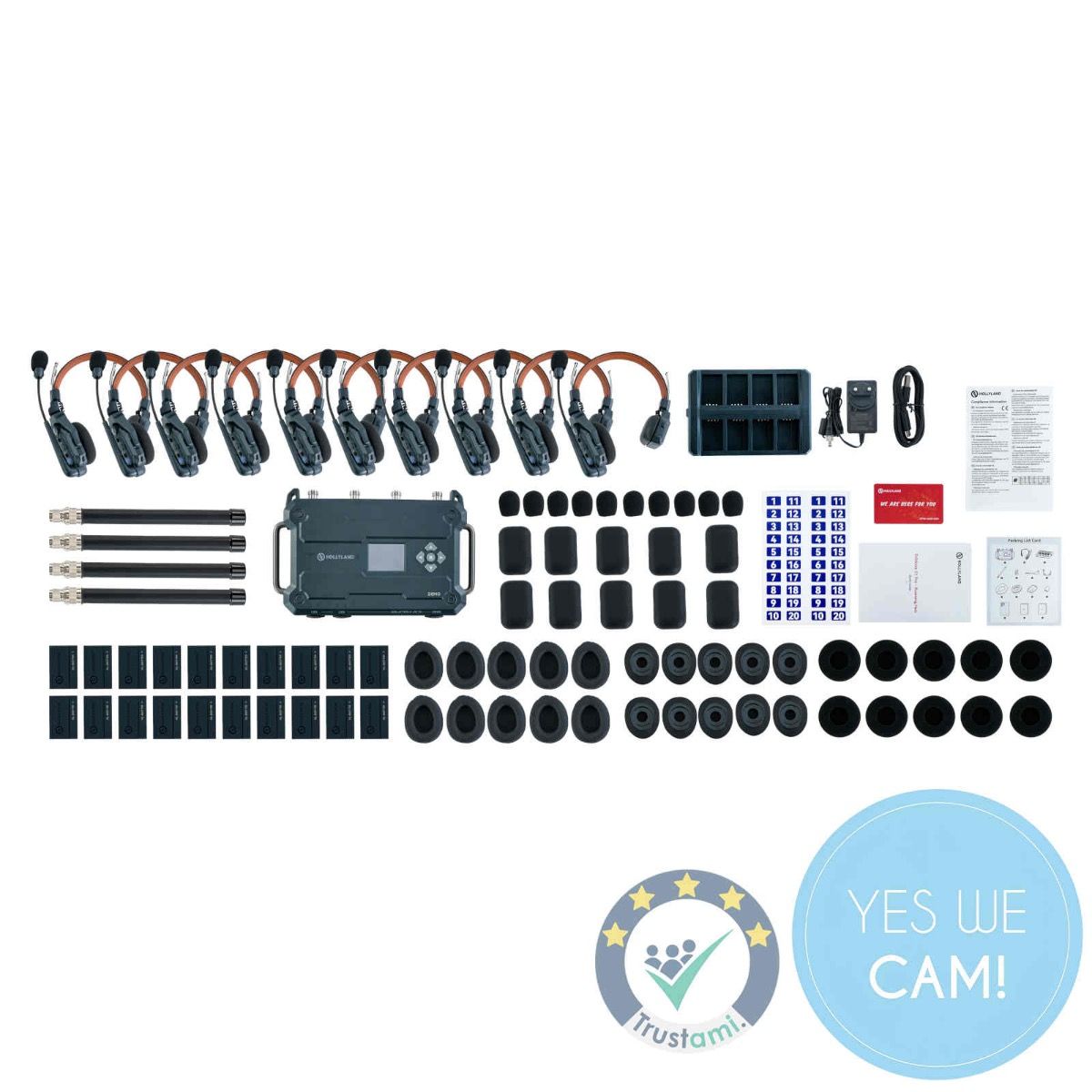 Mitgeliefert werden zehn kabellose Solidcom C1 Pro Ein-Ohr-Headsets mit geräuschunterdrückender ENC-Technologie, jeweils ausgestattet mit zwei Akkus für durchgehenden Betrieb. Das 8-Slot-Ladegerät sorgt für effizientes Power-Management. Over-Ear- und On-Ear-Gehörschutzoptionen, Mikrofon-Kissen, ein robustes Antennenset sowie alle nötigen Anschlusskabel und Adapter runden den Lieferumfang ab.