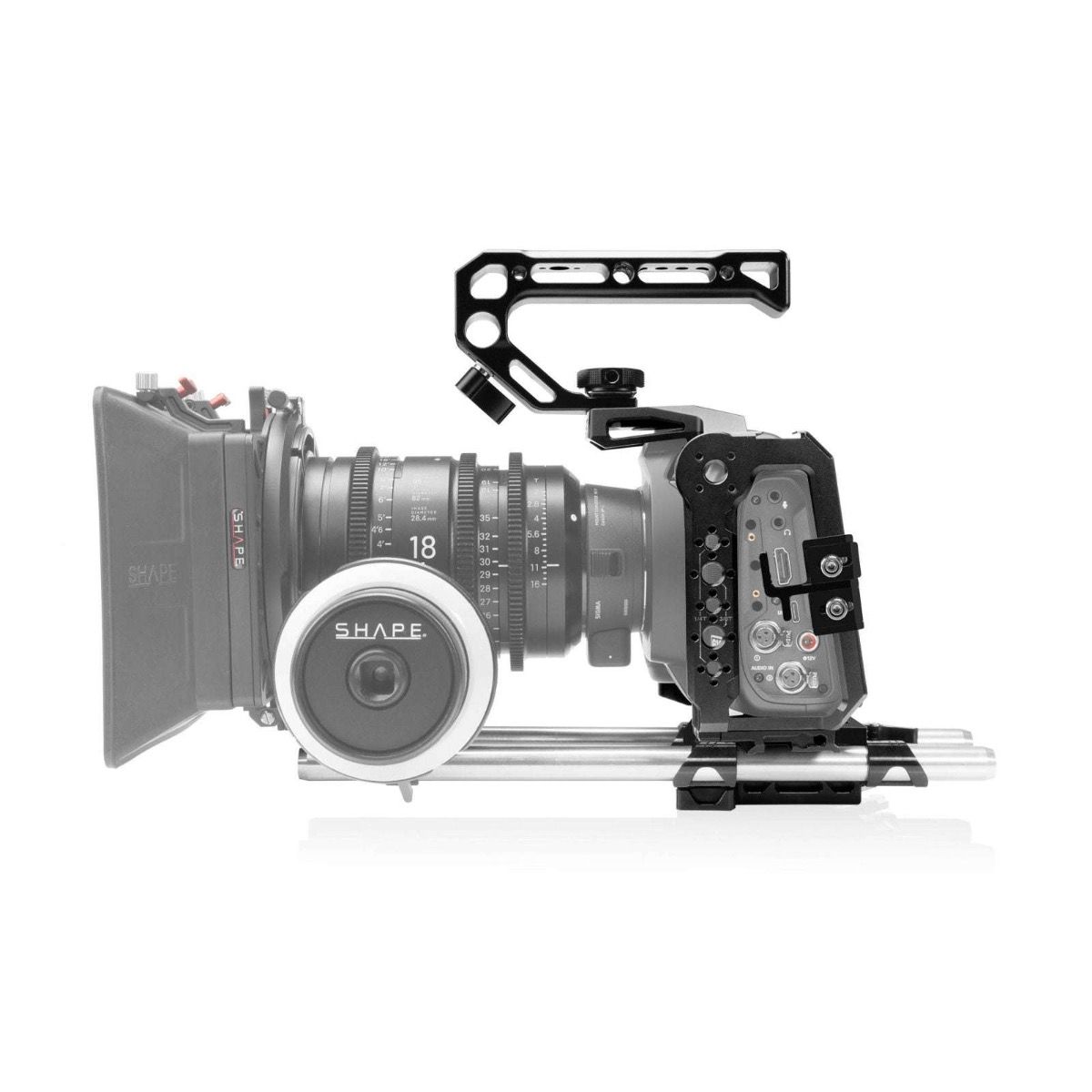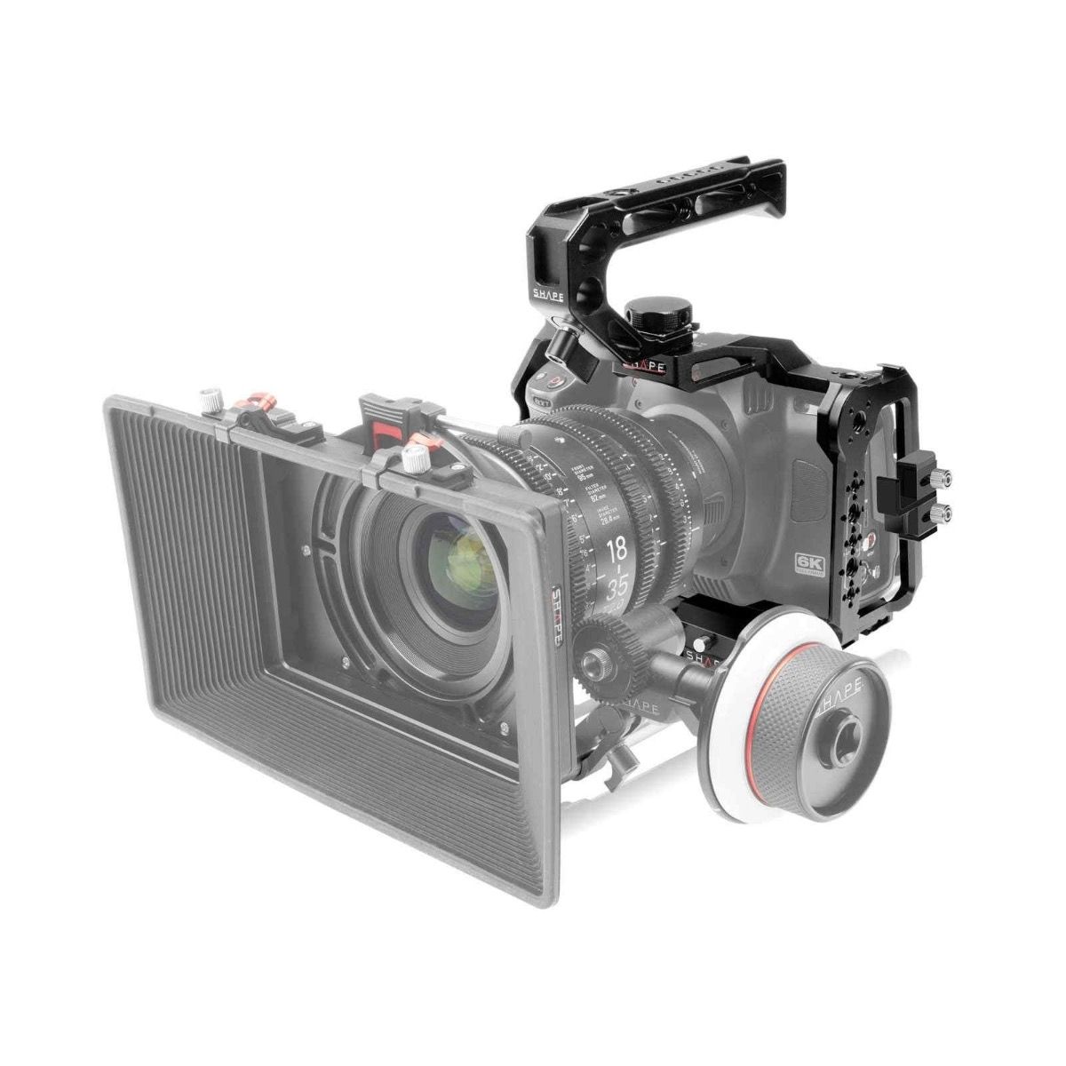 Der SHAPE Blackmagic Cinema Camera 6K/6K PRO/6K G2 Camera Cage, Top Handle und Rod Bloc System umfasst einen passgenauen Kamerakäfig, einen ARRI-kompatiblen Top-Griff sowie eine 15 mm Stabsystem-Grundplatte mit zwei robusten 15 mm Rods. Dieses Set bietet professionelle Filmemachern eine umfassende und flexible Lösung, um ihre Blackmagic Cinema Camera 6K, 6K Pro oder 6K G2 sicher zu montieren und mit weiterem Zubehör zu erweitern.