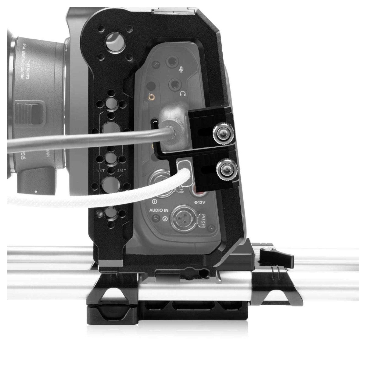 Die Unterseite des Cages ist Arca-kompatibel gestaltet und erlaubt eine schnelle, werkzeuglose Montage auf Quick-Release-Platten oder Gimbal-Systemen. An der linken Seite befindet sich eine NATO-Schienenhalterung, die sich ideal zur Befestigung eines optionalen Seitengriffs eignet. Zahlreiche 1/4"-20- und 3/8"-16-Gewinde sowie mehrere Cold Shoe-Halterungen bieten maximale Flexibilität zur Montage von weiterem Zubehör wie externen Monitoren, Funkstrecken oder Leuchten.
