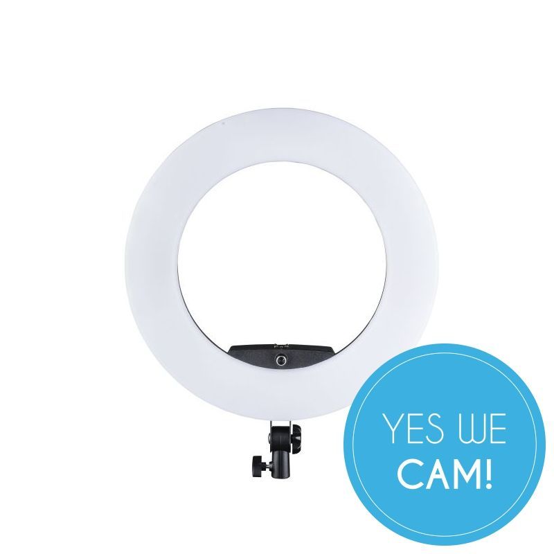 Die Ringleuchte verfügt über eine stufenlos neigbare Stativhalterung. Dank 16mm Zapfen (5/8 Zoll) Spigotanschluss kann die Ringleuchte an jedem handelsüblichen Lampenstativ befestigt werden. Eine Kamera können Sie auf dem mitgelieferten Kugelkopf montieren und auch die Aufnahme mit einem iPhone oder Smartphone ist dank Handyhalterung jederzeit möglich. Hierbei sind Sie durch zwei Blitzschuhadapter Halterungen (1x in der Mitte der Leuchte, 1x an der Oberseite des Gehäuses) sehr flexibel bei der Platzierung Ihres Equipments. So findet z.B. ein separates Mikrophon idealerweise Platz in der oberen Blitzschuhhalterung, während Ihr Aufnahmegerät sich zentral in der Mitte der Ringleuchte befindet.